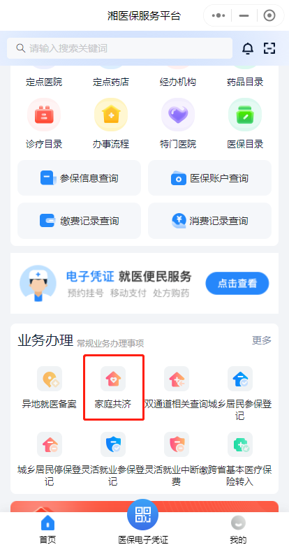 第一步:下載“湘醫(yī)?!盇pp,或進入“湘醫(yī)保”App小程序,登錄后在首頁“業(yè)務辦理”中找到“家庭共濟”,點擊“共濟申請”。